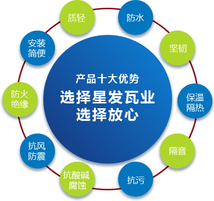 公司主要產(chǎn)品有《星發(fā)牌》合成樹脂瓦、APVC防腐耐候復合瓦、APVC發(fā)泡隔熱瓦、PVC半透明瓦、PVC防腐隔熱瓦、PVC防腐瓦、PVC防腐平板、PVC條紋板和ASA/PVC超耐候復合瓦等產(chǎn)品。產(chǎn)品一經(jīng)推出,已被廣泛應(yīng)用于國內(nèi)各類平改坡項目和大型工業(yè)項目,遠銷歐洲、亞洲、美洲和非洲等國外市場,還獲選為廣州亞運會、深圳大運會、四川災后重建等工程項目的應(yīng)用產(chǎn)品。公司在不斷創(chuàng)新和改革的基礎(chǔ)上,力求以更好的產(chǎn)品、優(yōu)良的服務(wù),用心、專心服務(wù)好每一個客戶。